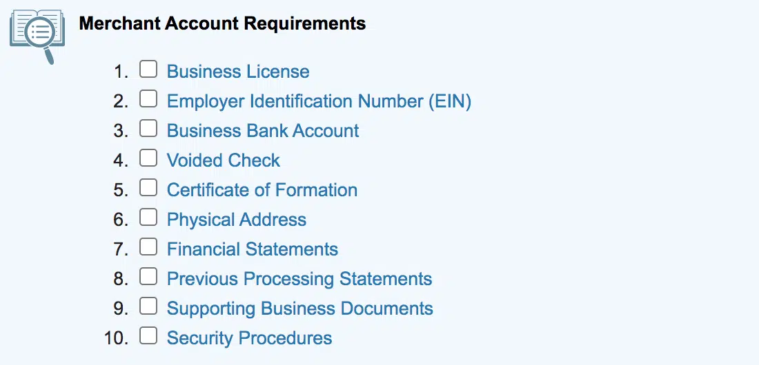 CreditDonkey wrote a great article that covers the 10 essential merchant account requirements: