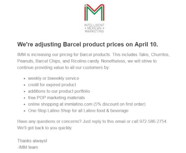 Here’s an example of a pricing increase email from Barcel. Note the directness of their subject line: