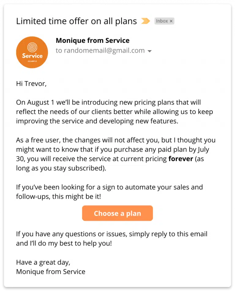 It’s also a good idea to send a pricing change email even to your customers on a free plan or trial, as the increase might affect them if they decide to buy an upgrade any time soon.