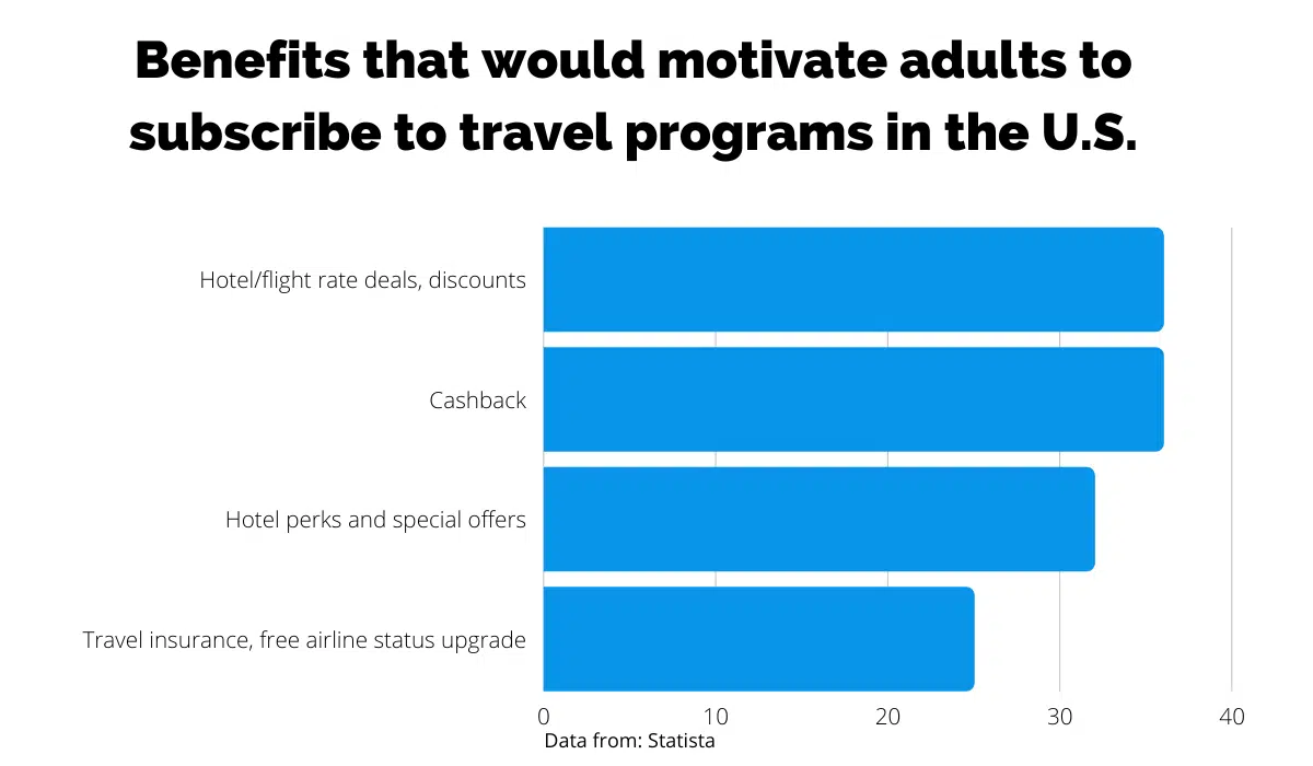 Statista’s November 2021 research found that hotel deals and the opportunity to get cashback when traveling were the main factors that motivated adults in the USA to subscribe to travel programs.
