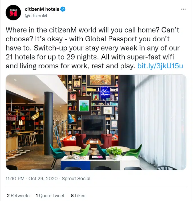 The CitizenM hotel chain targeted digital nomads with its Global Passport, offering a 30-day stay at their hotels for USD 50 per night.