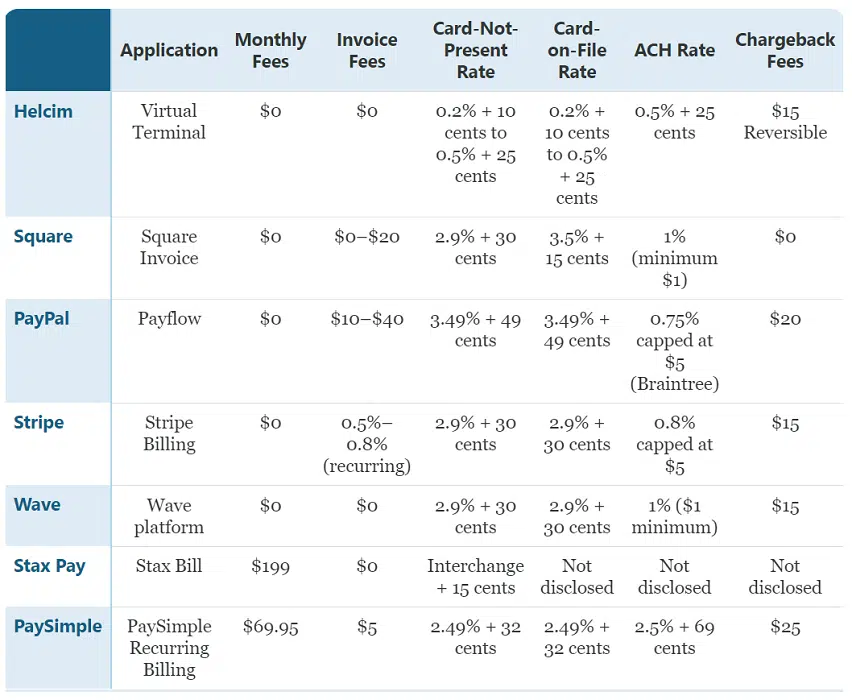 Most payment processors charge a monthly fee plus a percentage of the transaction, and there are also a card-not-present fee and an invoice fee.