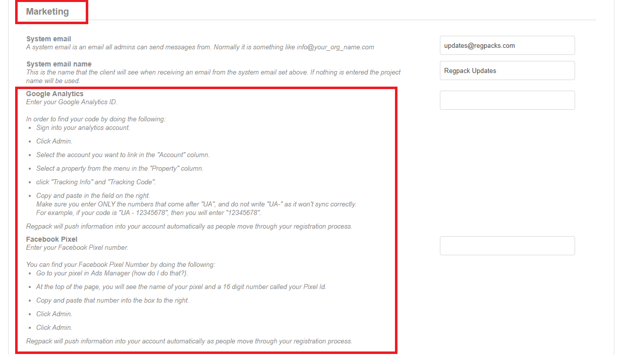Regpack can push user activity directly to your Google Analytics account. Whether you are creating ads through AdWords, or simply checking Google Analytics to understand your users and their activity better, adding your tracking code in Regpack will be very useful!