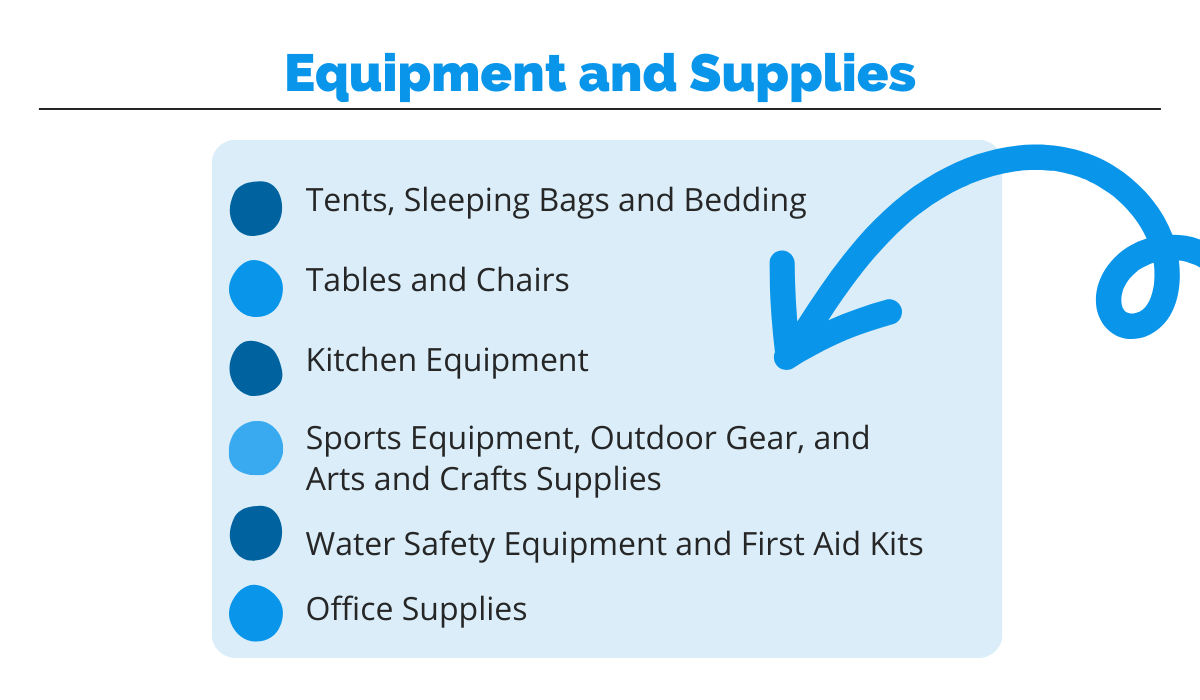 A great camp with a lot of programs, activities, and facilities will require an investment in various supplies and equipment. Take a look at some of the various items you may have to buy in the following image.