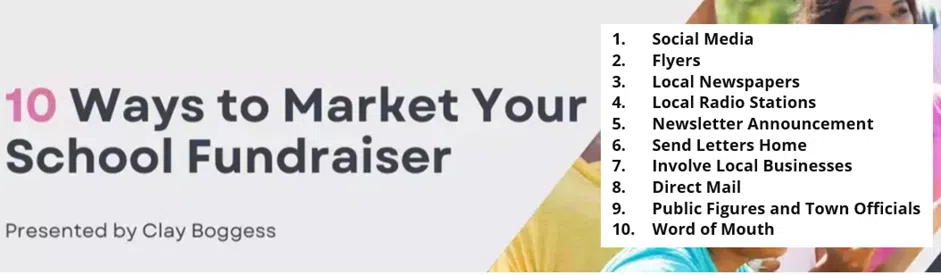 Here’s a list compiled by Clay Boggess, a fundraising expert, that includes both digital and traditional ways you can use to market your school fundraiser: