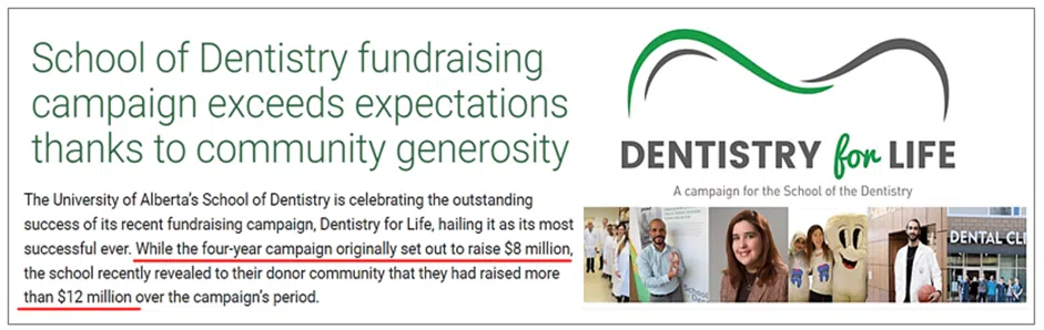 However, meticulous planning can generate outstanding results, like in this example of a 4-year fundraising campaign run by the school of dentistry, which exceeded its initial goal—collecting 8 million dollars—by 50%.