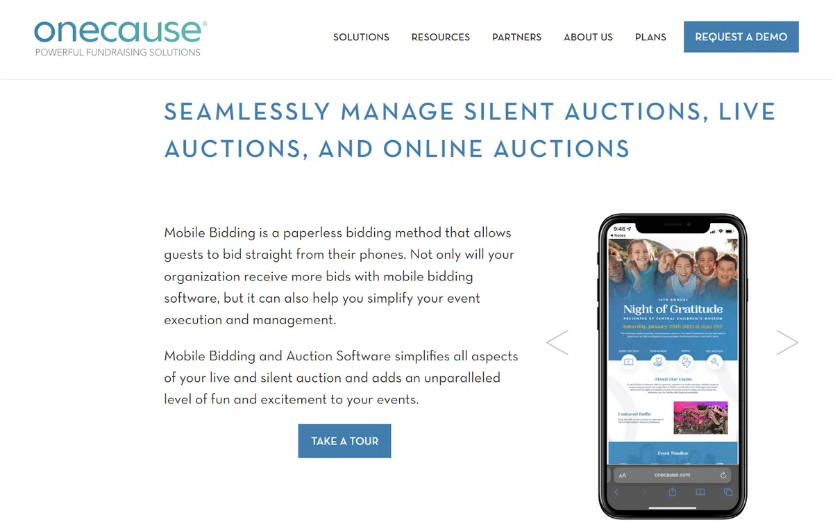 While some of the services on this list lack an integrated auction function, OneCause uses it as one of its main selling points.