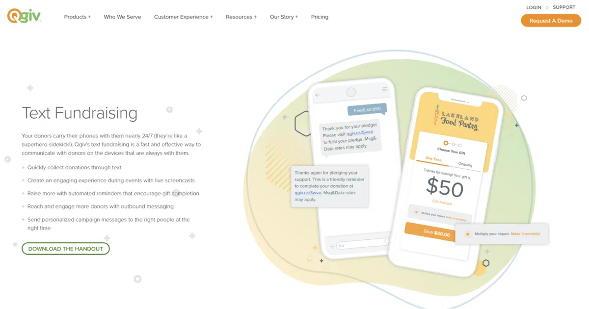 They also offer bundled products for a quoted price, which include an upgrade to a higher tier, a text-to-give feature, and wealth insights from DonorSearch.