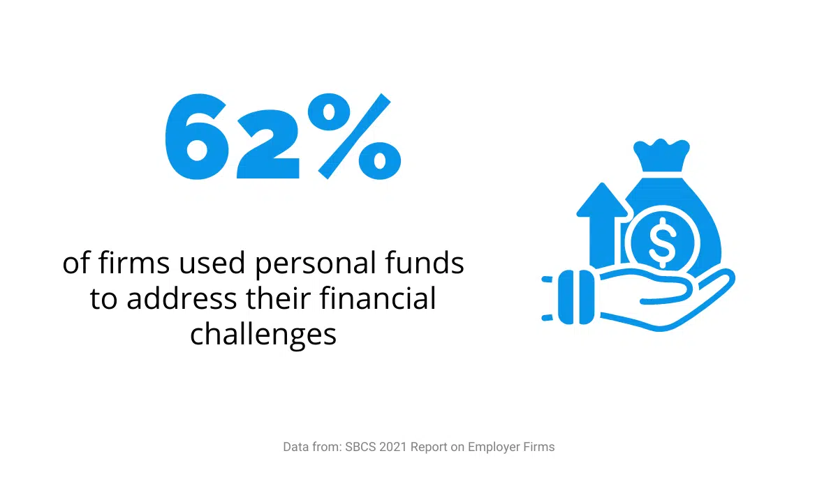 The Small Business Credit Survey (SBCS) 2021 Report on Employer Firms found that in 2020, 62% of small businesses used their personal funds to tackle their financial challenges.
