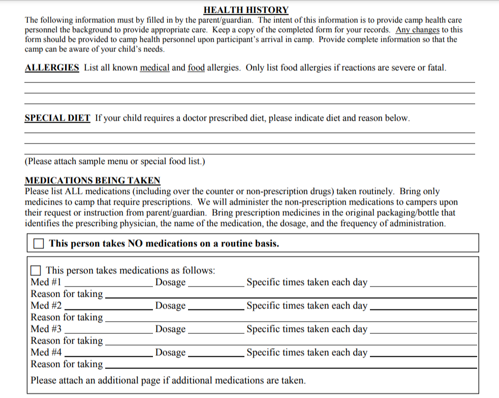 This is where the campers’ medical documentation comes in. It’s advisable to send the documentation to parents to fill out before camp starts.