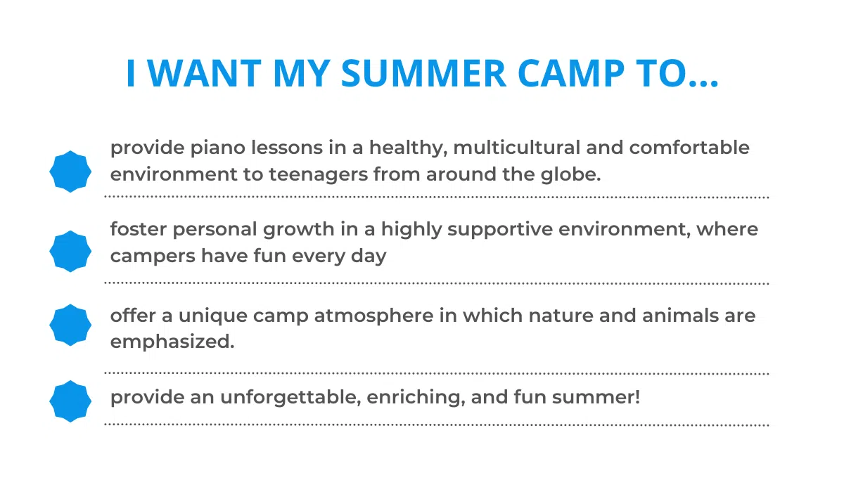 Go back to that list of goals you’ve compiled. Think about what you want your campers to achieve during camp.