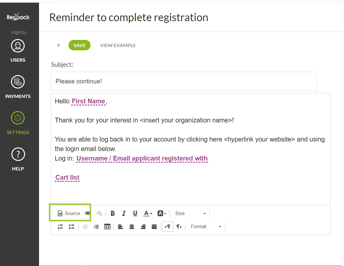 If you use Regpack, it’s easy to personalize emails with merge tags embedded in the body or subject line of an email like this one: