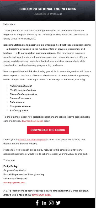 The email body is full of helpful information on that program, with a link to the program page and a CTA button inviting the student to download an in-depth ebook.