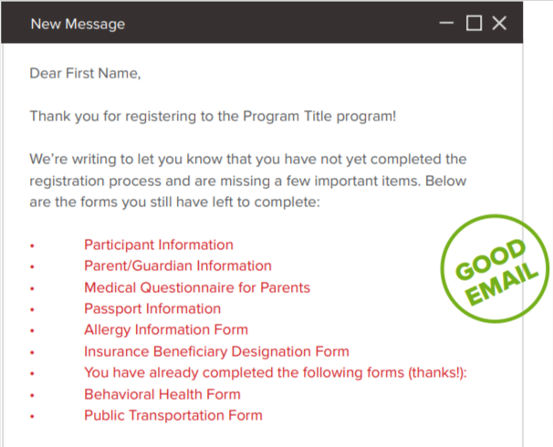 A little pro tip: to make this part of the sign-in go smoothly, it’s best to use camp registration software like Regpack that’ll automatically inform registrants if any important items are missing during the registration process.