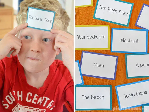 The cards usually have the name of some famous person on them, but you can also write an animal, an item, or basically anything that can be easily described.
