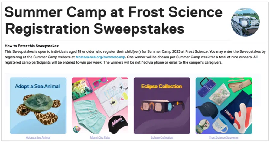 For instance, the Frost Museum of Science in Florida ensures that all registrants for their one-week summer camps participate in the sweepstakes awarding a $100 gift card for the museum’s Science Store.