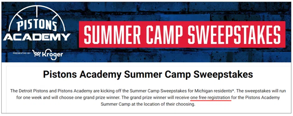 For instance, you can offer parents who register (no payment necessary) to win a free one-week summer camp for their child, as the Detroit Pistons Academy does.