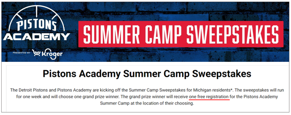 For instance, you can offer parents who register (no payment necessary) to win a free one-week summer camp for their child, as the Detroit Pistons Academy does.