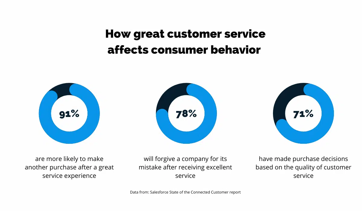 This is backed by data from the Salesforce State of the Connected Customer report, in which 91% of customers said they’re more likely to make another purchase after a great service experience.