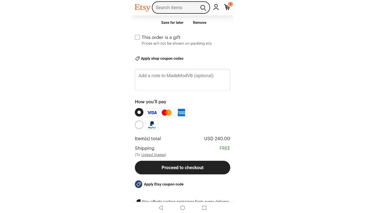Sites like Etsy make it very easy for customers to add items to the cart and proceed to checkout.