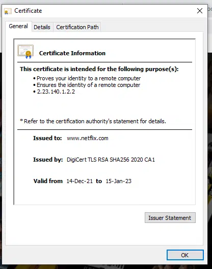 For example, a glance at Netflix’s URL will show you the site is secure, as will clicking on the lock icon to check security details.