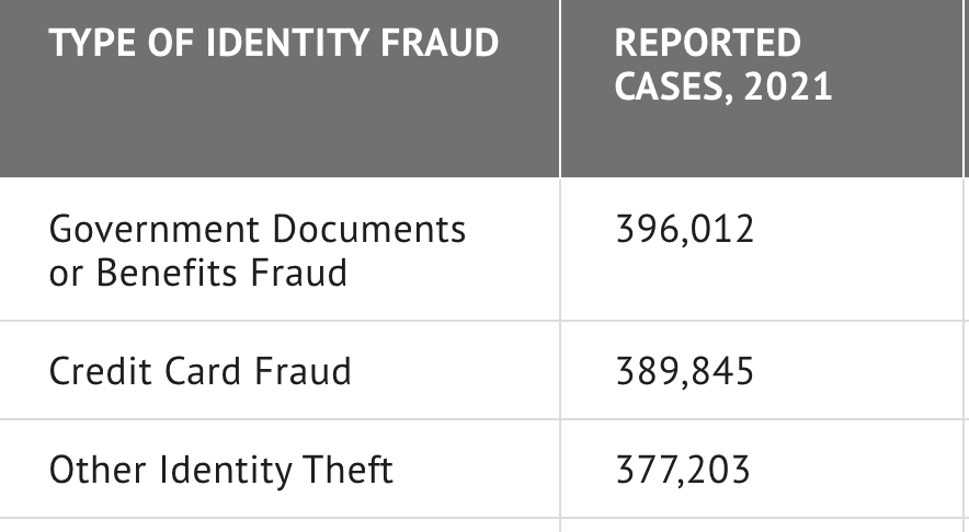 However, it still happens from time to time. There were 389,845 reported cases of credit card fraud in 2021, making it the second most common type of identity fraud: