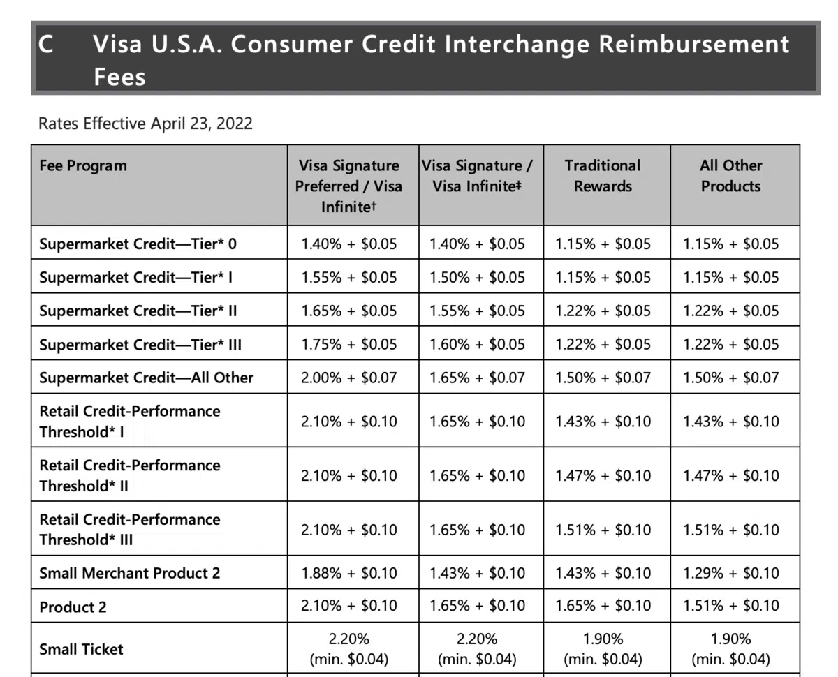 Some credit networks publish their interchange fee tables, which include a long list of categories. For example, here’s an excerpt of Visa’s interchange fee table: